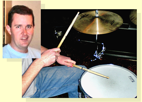 He plays a Pearl set, Zildjian cymbals, and assorted percussion supplements.